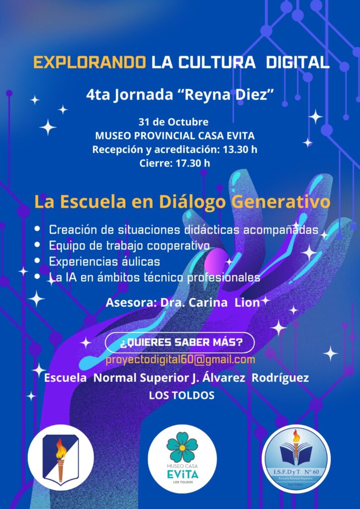 Docentes, estudiantes y especialistas reflexionarán sobre el presente y futuro de la educación en tiempos digitales. El próximo 31 de octubre, la Escuela Normal Superior “Justo Lucas Álvarez Rodríguez” —Unidad Académica de Los Toldos— llevará adelante la 4ª Jornada Educativa “Reyna Wilson de Diez”, bajo el lema “La escuela en diálogo generativo”. En esta edición, el encuentro tendrá lugar en el Museo Casa Evita, y convocará a docentes, estudiantes y público en general a participar de una jornada de reflexión sobre los desafíos actuales de la enseñanza en un contexto de profunda transformación tecnológica y cultural.